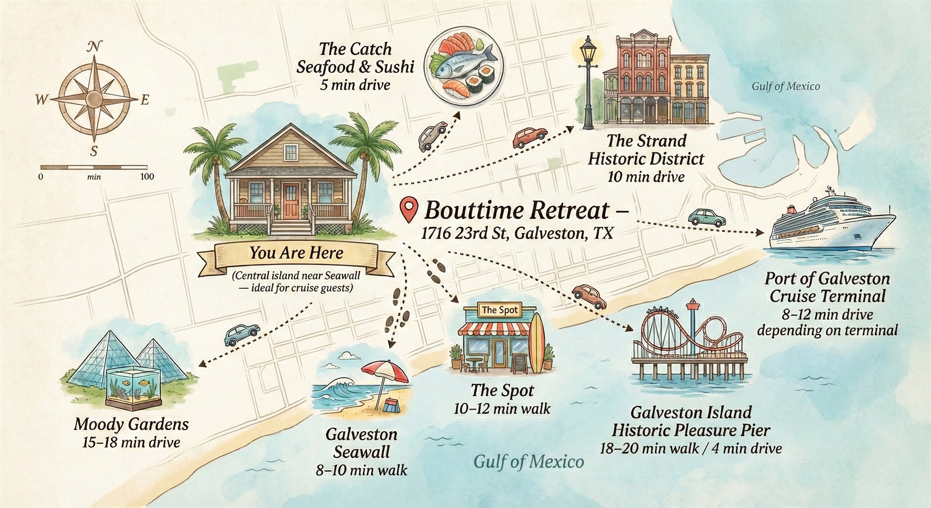 Welcome to your elevated island escape—new + luxe accommodations, oversized bathrooms, and a central location that keeps you close to everything. You’re a short walk to the Seawall/beach and near Pleasure Pier area attractions, dining, and fun.