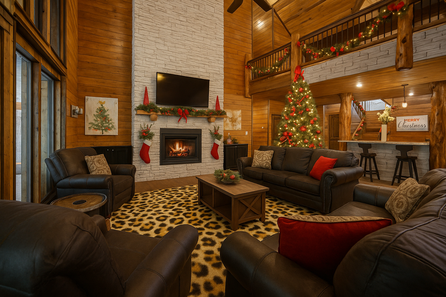 With 6 bedrooms, 5 full baths, and 2 half baths, this cabin comfortably sleeps up to 20 guests—perfect for families, friends, and couples looking for a peaceful getaway.