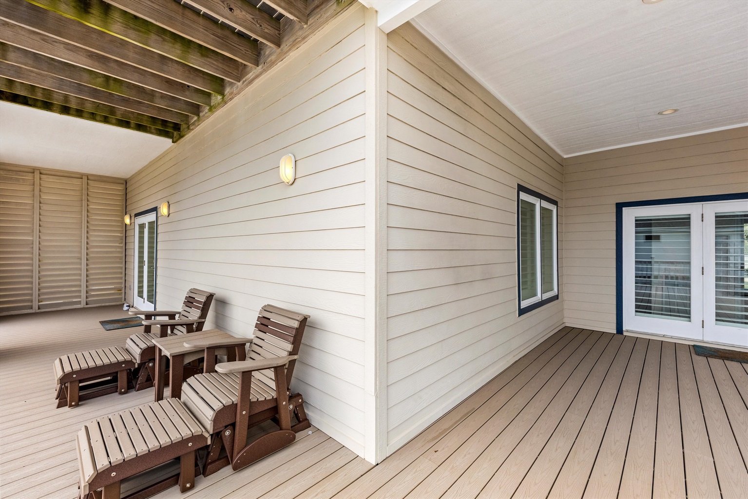 Outdoor spaces are a standout: 2 levels of covered patios with generous seating 🪑, big grassy area 🌿 for games, corn hole 🎯, and plenty of spots to catch sunrise and sunset from the decks 🌅🌙